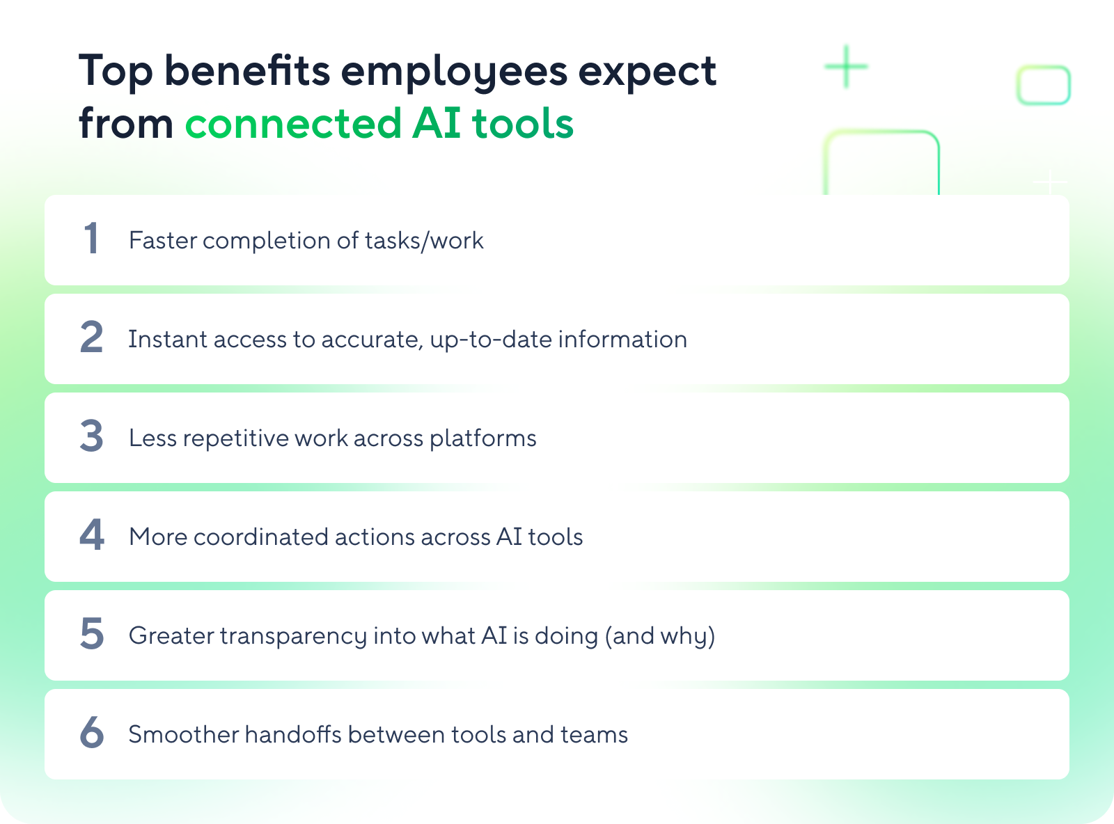 Employees are eager to leverage the power of AI, but they need tools that work together. They want AI solutions that can understand the context of their work, share information across different applications, and automate tasks that span multiple departments. In essence, they're looking for an AI-powered ecosystem that enhances their existing workflows, rather than adding more complexity.